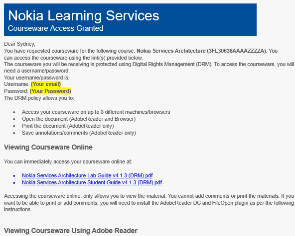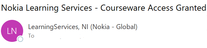 Within 3 days of purchase, you will receive your certification courseware from ni.learningservices@nokia.com in an email, with the subject line: Nokia Learning Services - Courseware Access Granted.